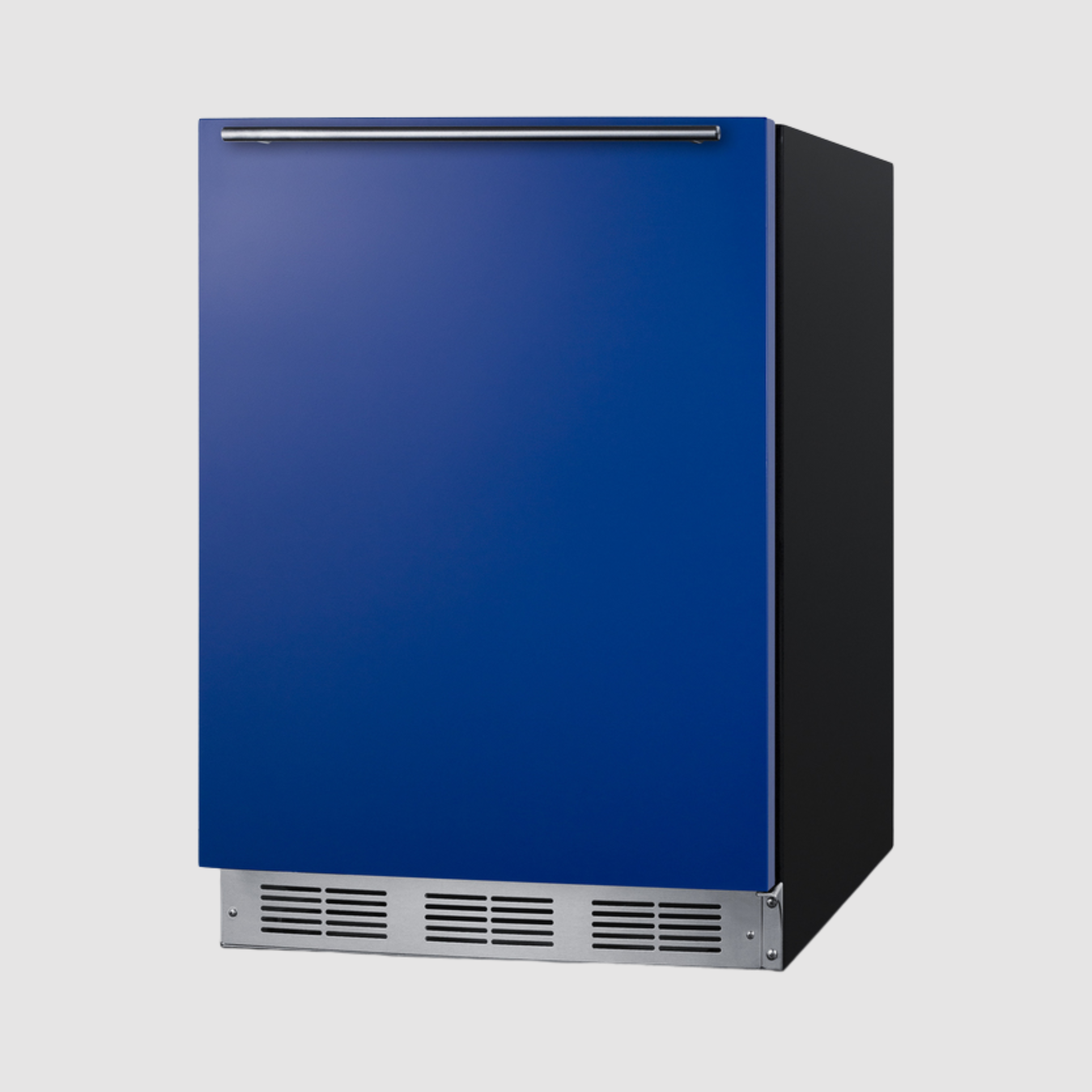 Bring bold European design to your space with the Summit BAR631BKBADA, a striking cobalt blue refrigerator tailored for ADA-compliant kitchens. With its 24” width and 32” height, this unit fits perfectly under lower counters and features stainless steel accents paired with a jet black cabinet. The 5.5 cu.ft. interior includes adjustable spill-proof glass shelves, a crisper drawer, removable wine shelf, and three door racks all cooled efficiently by a cold wall system with automatic defrost to reduce maintenance.